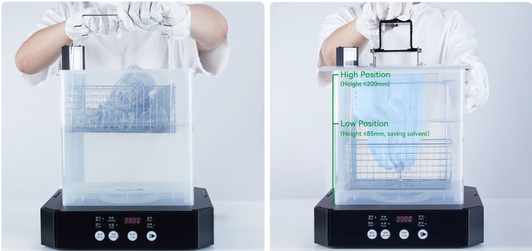 Une machine 2 en 1 à l'encombrement réduit permettant à la fois de nettoyer vos pièces en douceur (nettement moins agressif que les ultrasons) à l'Alcool IPA ou autre solution de nettoyage mais aussi d'effectuer le post traitement UV pour finir la polymérisation.